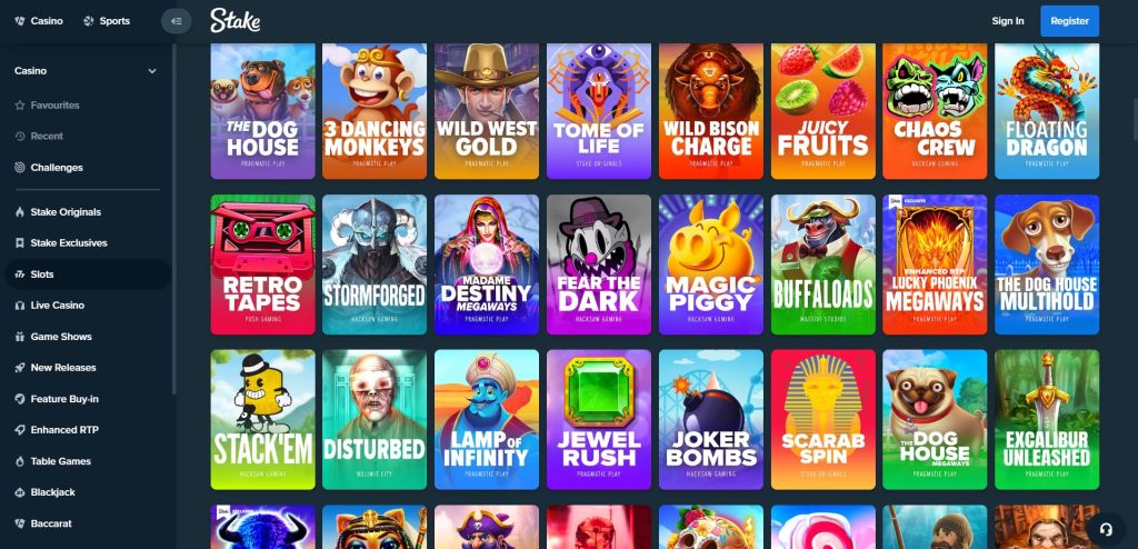 Одним из преимуществ Stake является обширная коллекция игр — более двух тысяч слотов и других развлечений. Они распределены по категориям: