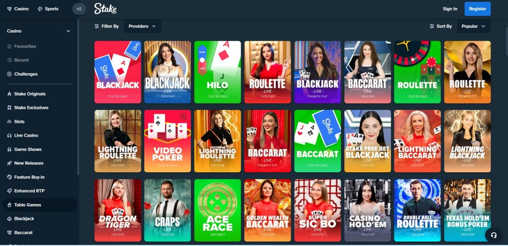 В казино Stake представлены игры от известных провайдеров. В разделе Providers вы найдёте студии NetEnt, BGaming, Playson, Spinomenal и другие, а также количество игр каждого разработчика.